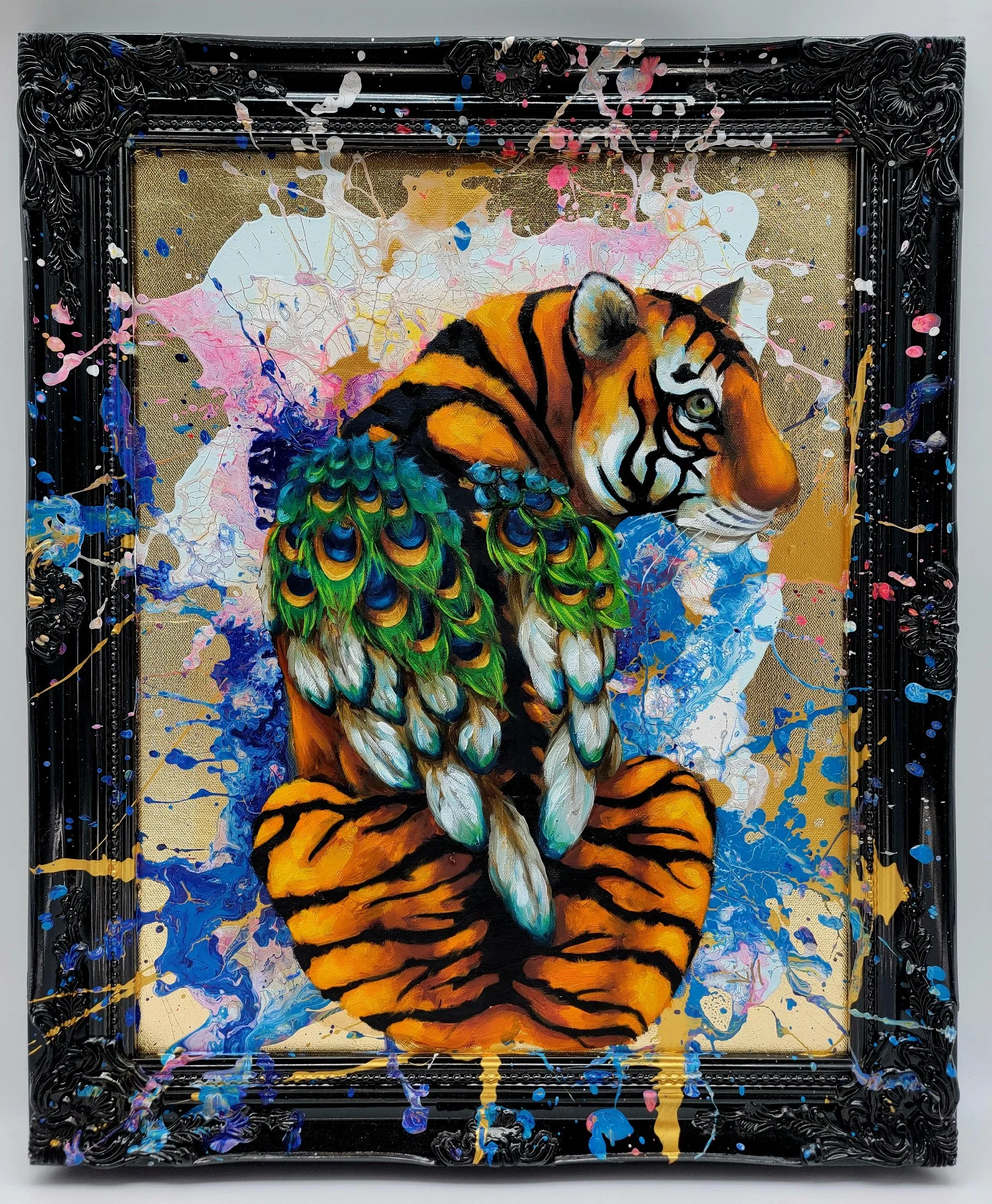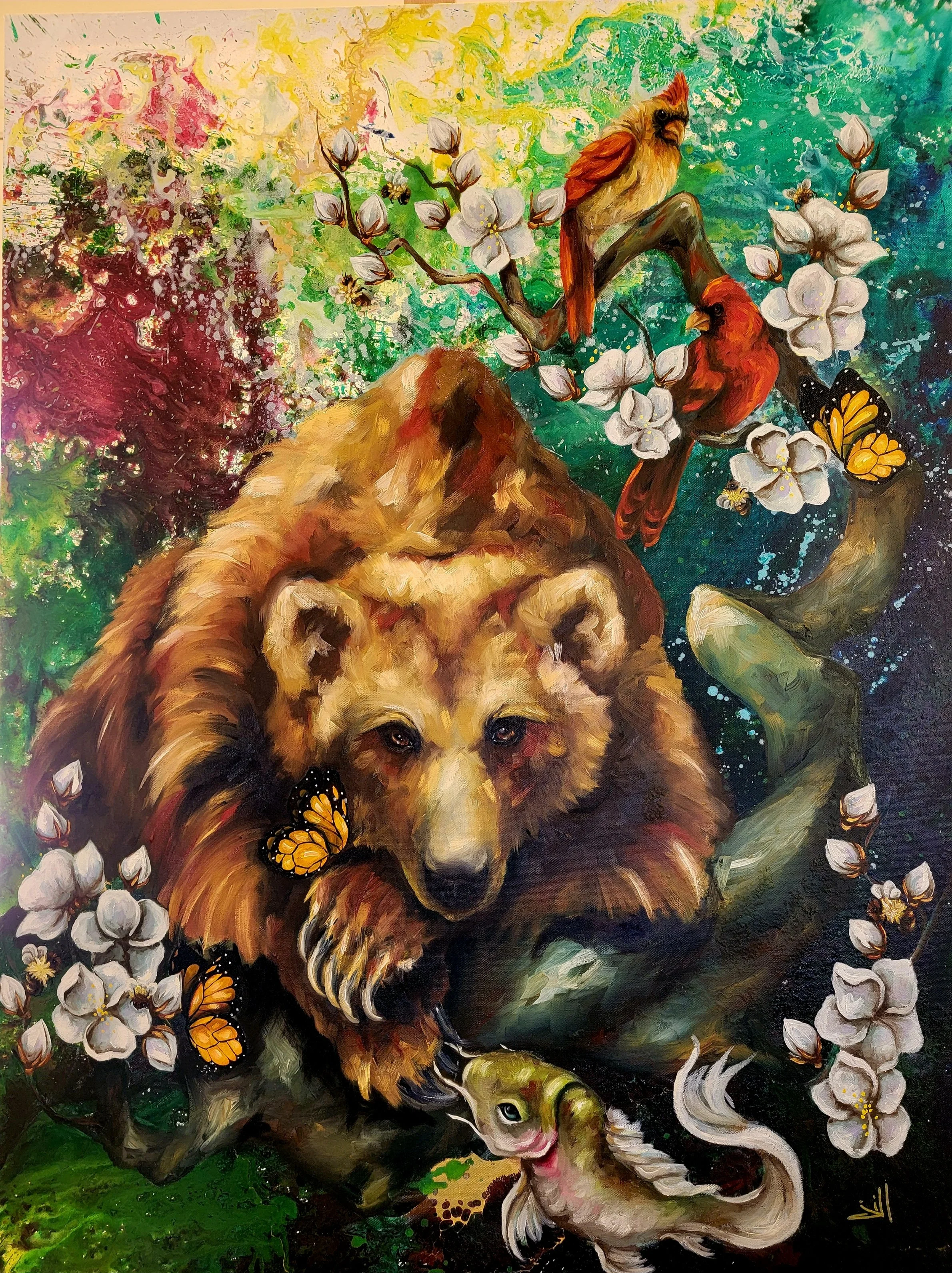 Once the background is complete Jill reads what the background will be a background of. Almost all of her pieces have a branch filled with flowers. The main characters of her pieces can be anything from elephants to bee’s or even tigers. The foreground is all completed in oils which pushes it further in front of the background.