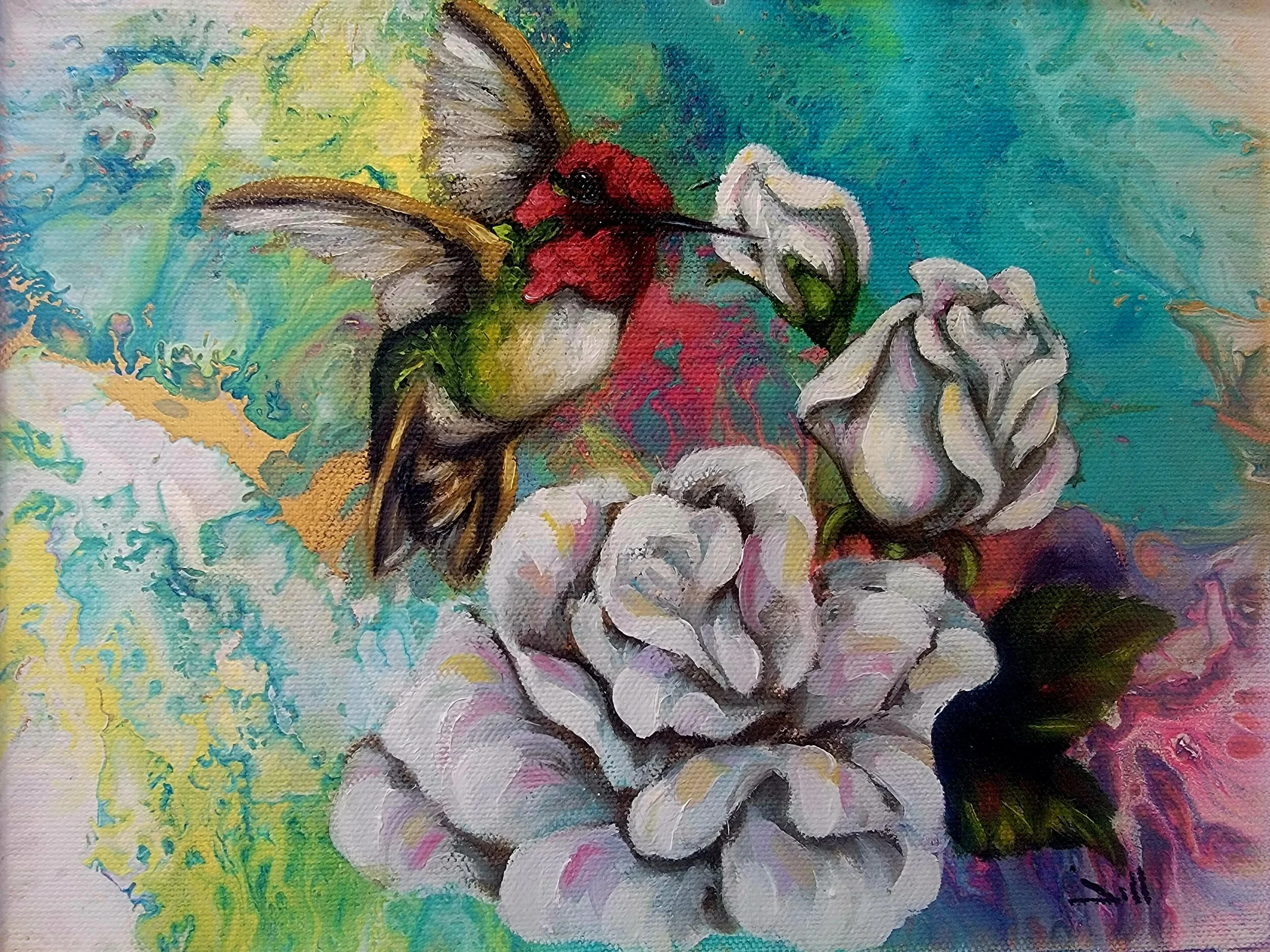 Each of Jill’s paintings begins with an abstract background. This is done outside with the piece laying flat on the ground. Acrylic paint is then splattered all over the canvas this process is very messy. This layer requires a lot of quick intuitive thinking as the colors mix and cover the canvas. There is no plan for splattering of the paint just reading how the paint is mixing and what the canvas needs.