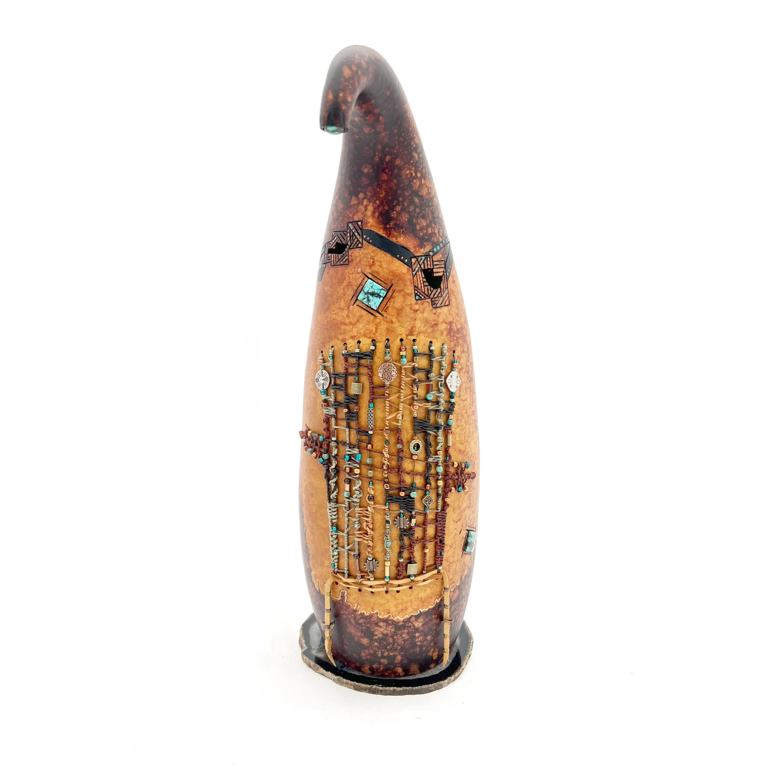 After stepping away from my previous career in business management, I have been working with gourds since 1992. I have tried many techniques but I really enjoy weaving and adding various types of fibers and natural objects to my pieces. Since every gourd is different, it’s always fun to start a new piece and see what develops. I love creating interesting vessels and containers from gourds and adding fibers, items from nature, interesting embellishments and found objects into my work. Gourds are the perfect medium for me to express and explore my artistic passions.