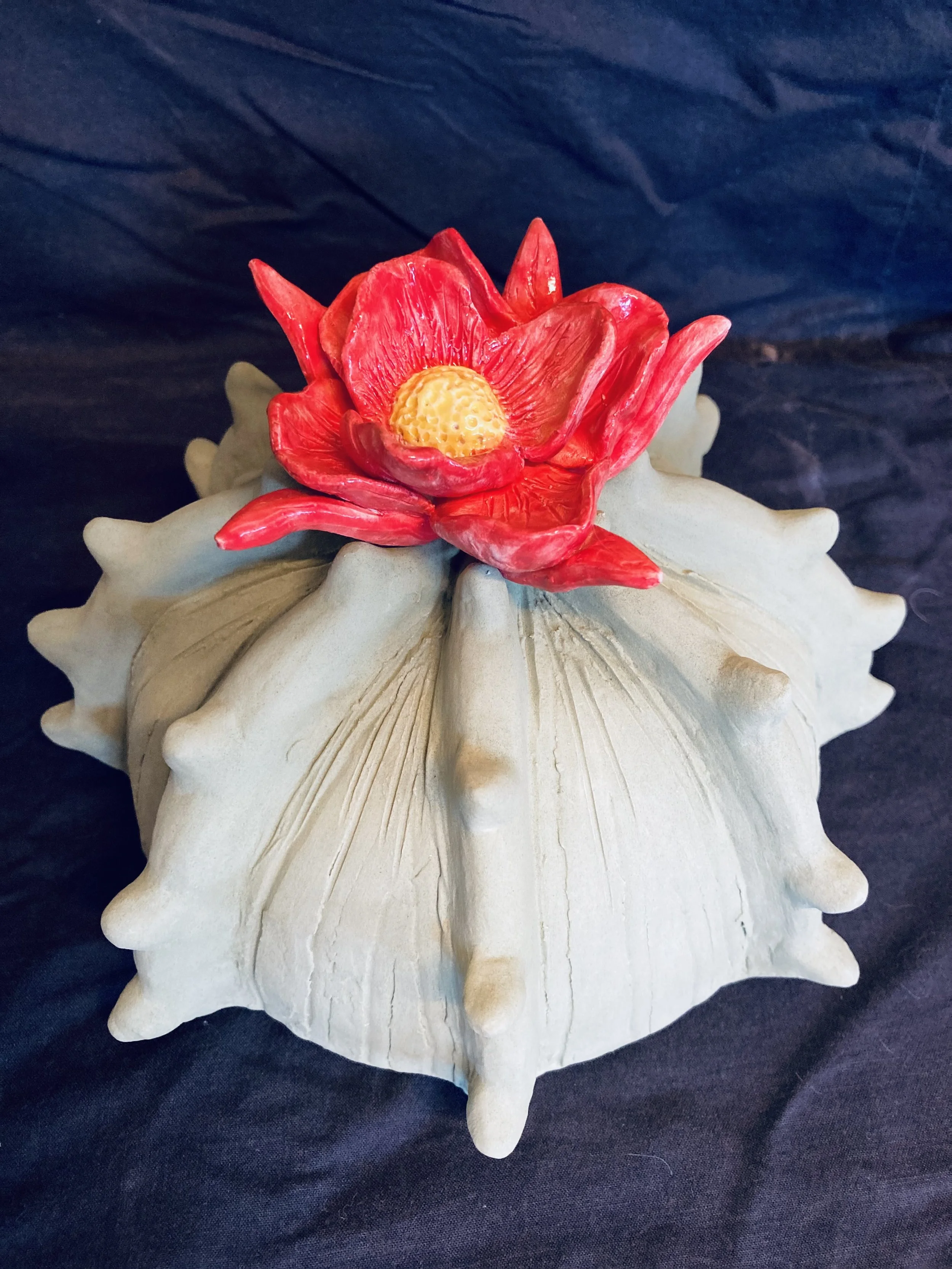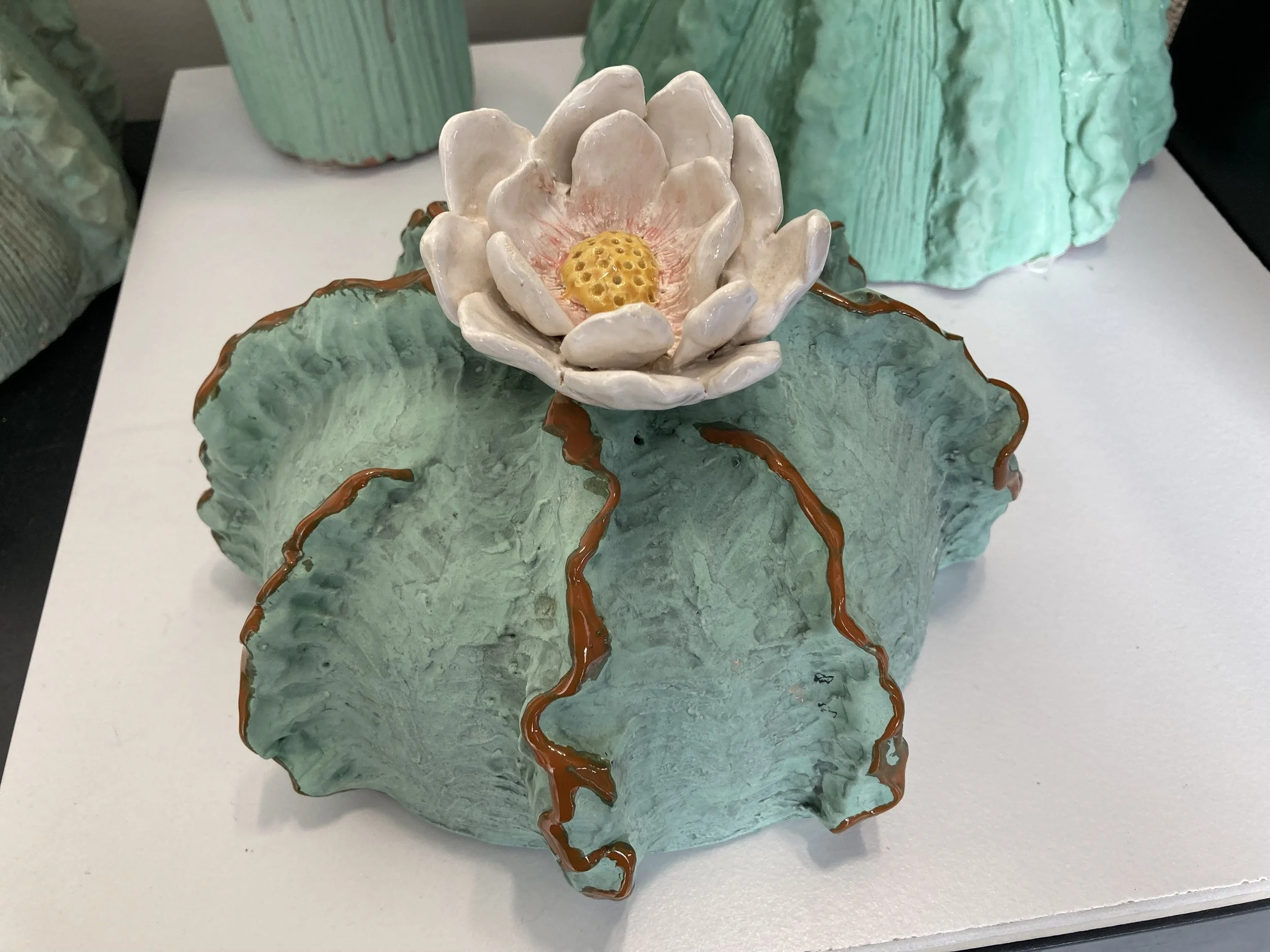 Each of my pieces are hand built using slab and coil techniques. Colors are added by using underglazes and glazes and then they are low fired. Each piece is fired one to two times depending on the look I want to achieve.