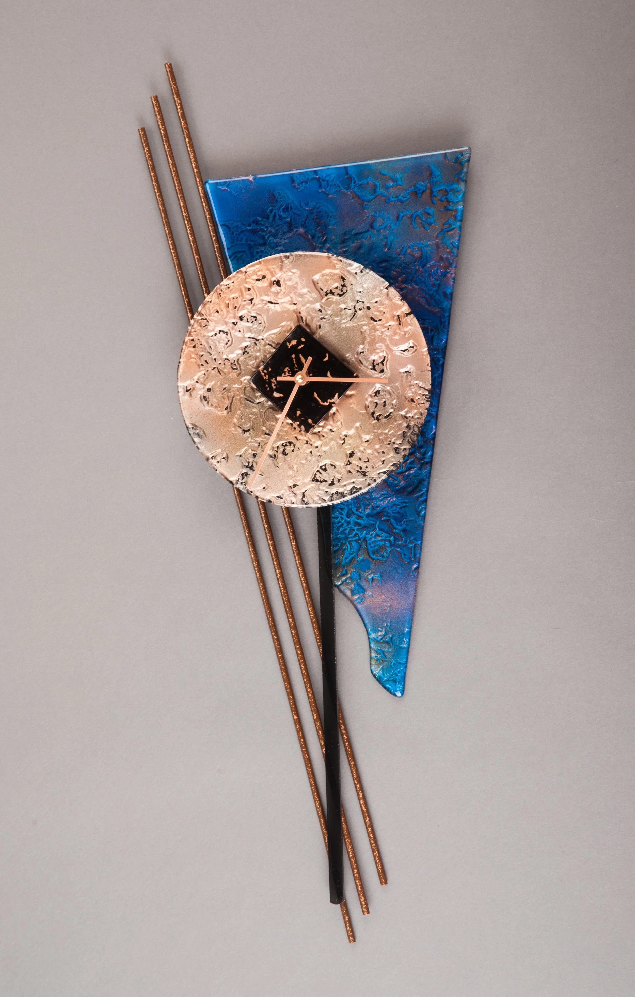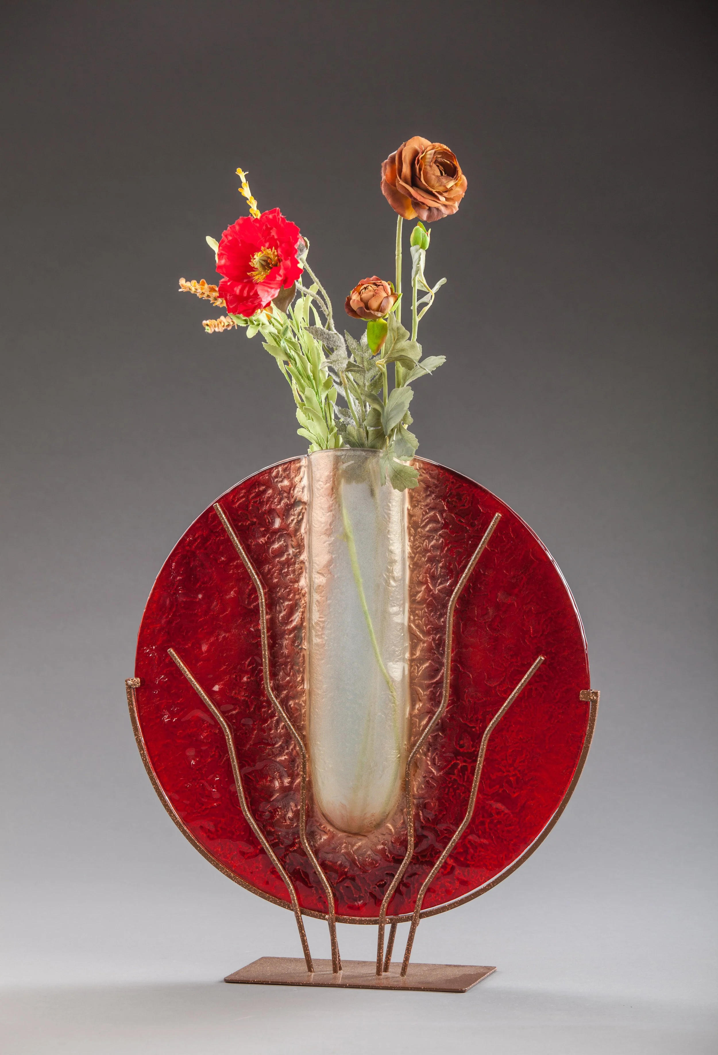 Mark currently produces a large and varied line of modern slump glass pieces making use of knowledge he gained while working with stained glass and ceramics. Sand molds give the glass an organic look and iron stands make the pieces very functional. His clients, many of whom are interior decorators, began requesting oversize pieces and Mark has been able to accommodate their requests with large glass vases, bowls, chargers and candlestick holders.