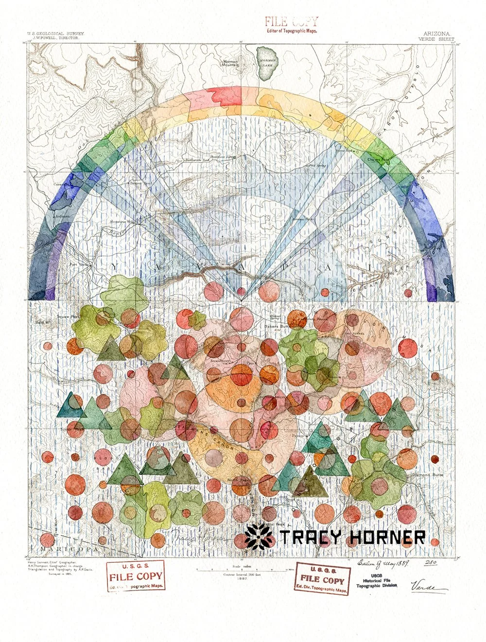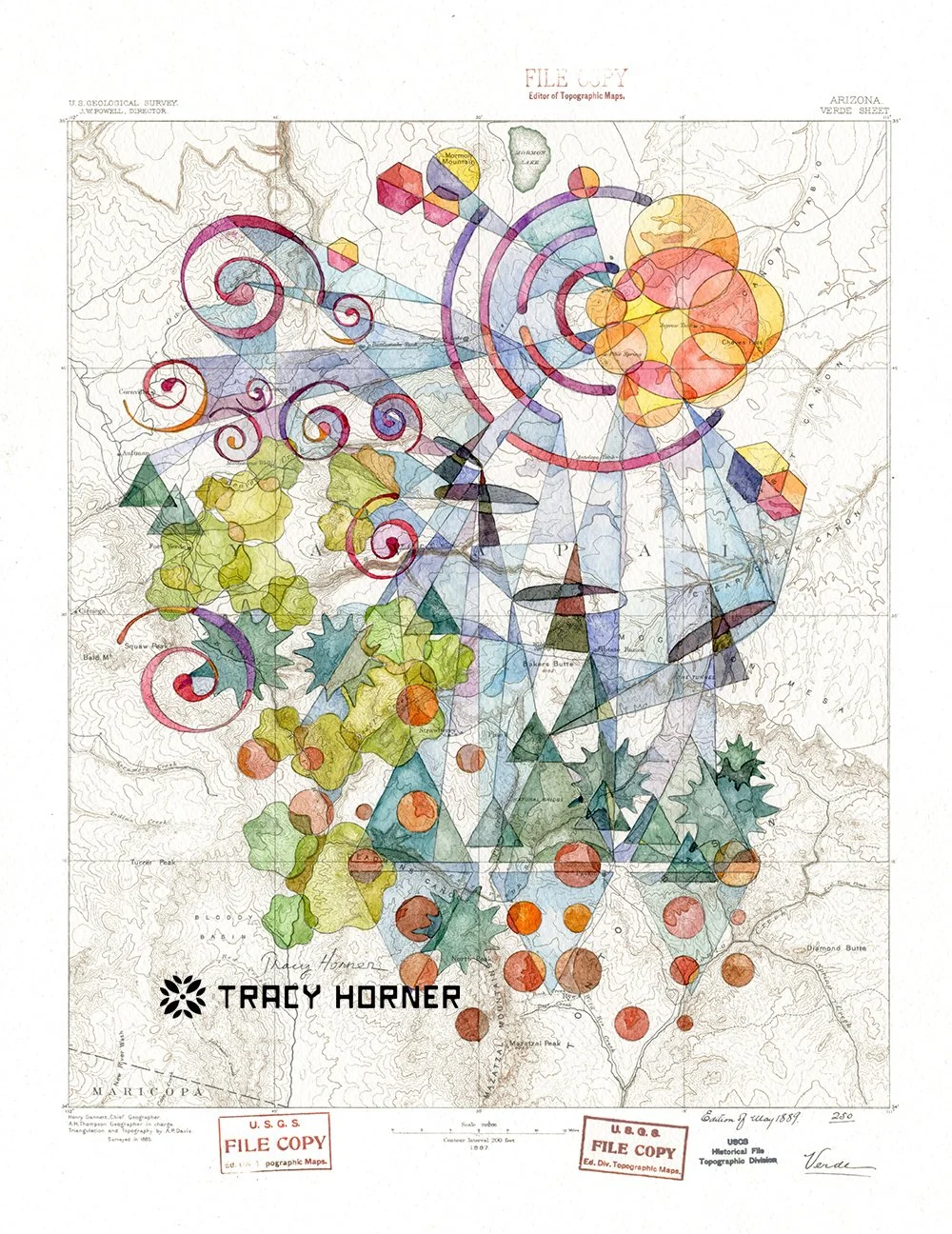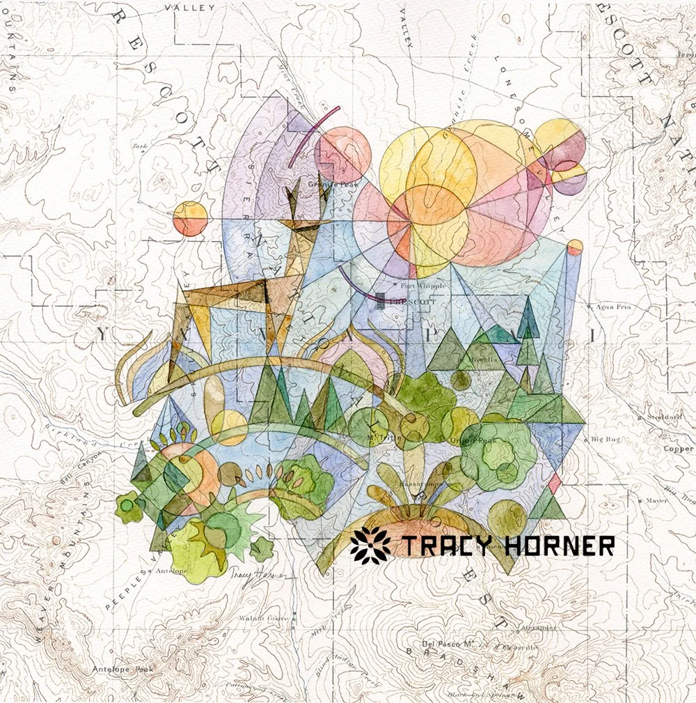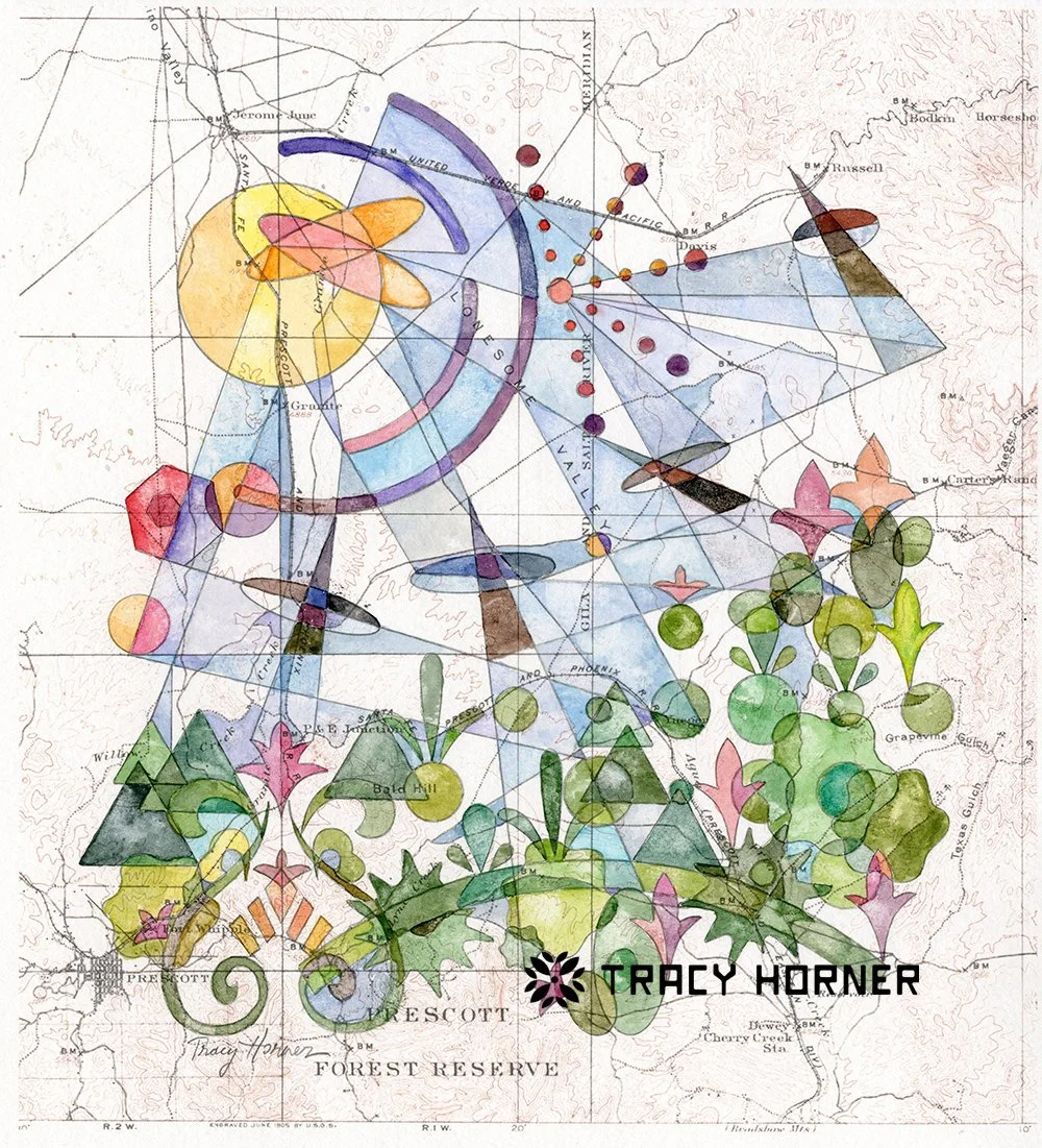 I grew up loving math and the sciences, so unsurprisingly l became an engineer. I appreciate the beauty in symmetry, structure, and pattern and carry that into my art. My latest series of paintings begins with copies of historical USGS topographical maps printed onto watercolor paper. I use a collection of pencil construction lines made with rulers, compasses, and shape templates to create abstracted versions of the plants and animals that can be found in the map’s area. I add watercolors and watch the landscape unfold. To make the sky as interesting as the terrestrial shapes, I’ve developed a watercolor analogy to the lens flare phenomenon. The maps provide a sense of place to anchor my visions and explore the surroundings. I’ve focused on Arizona locations for the gallery art but am accepting commissions for other custom locations and features.
