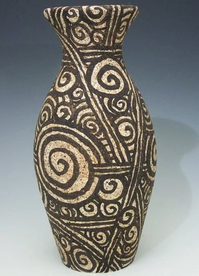“I design most of my own glazes and use a variety of decoration techniques that I have learned over the years including over-glaze, engobes, matte glazes, sgraffito, wax resist, carving, and incising.”