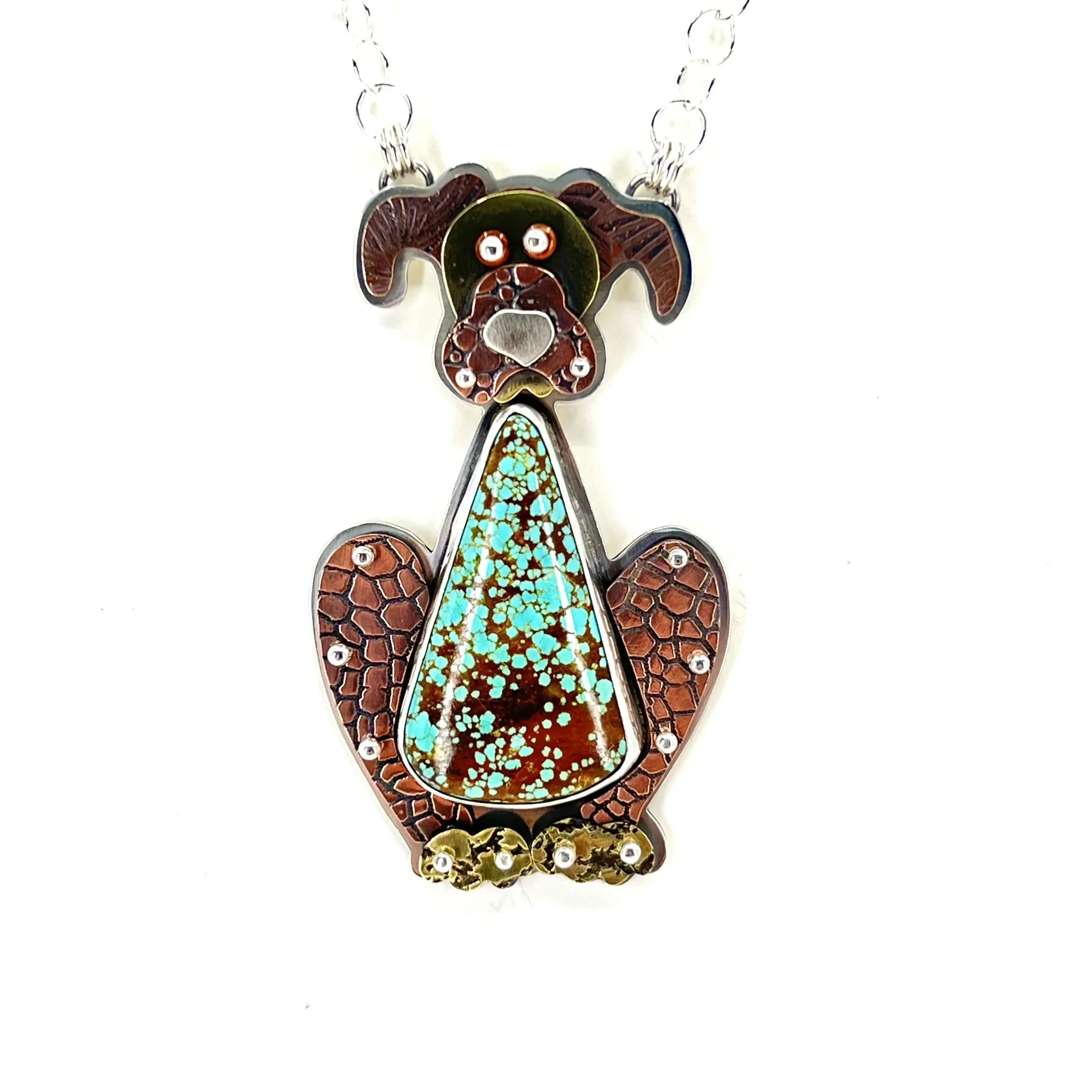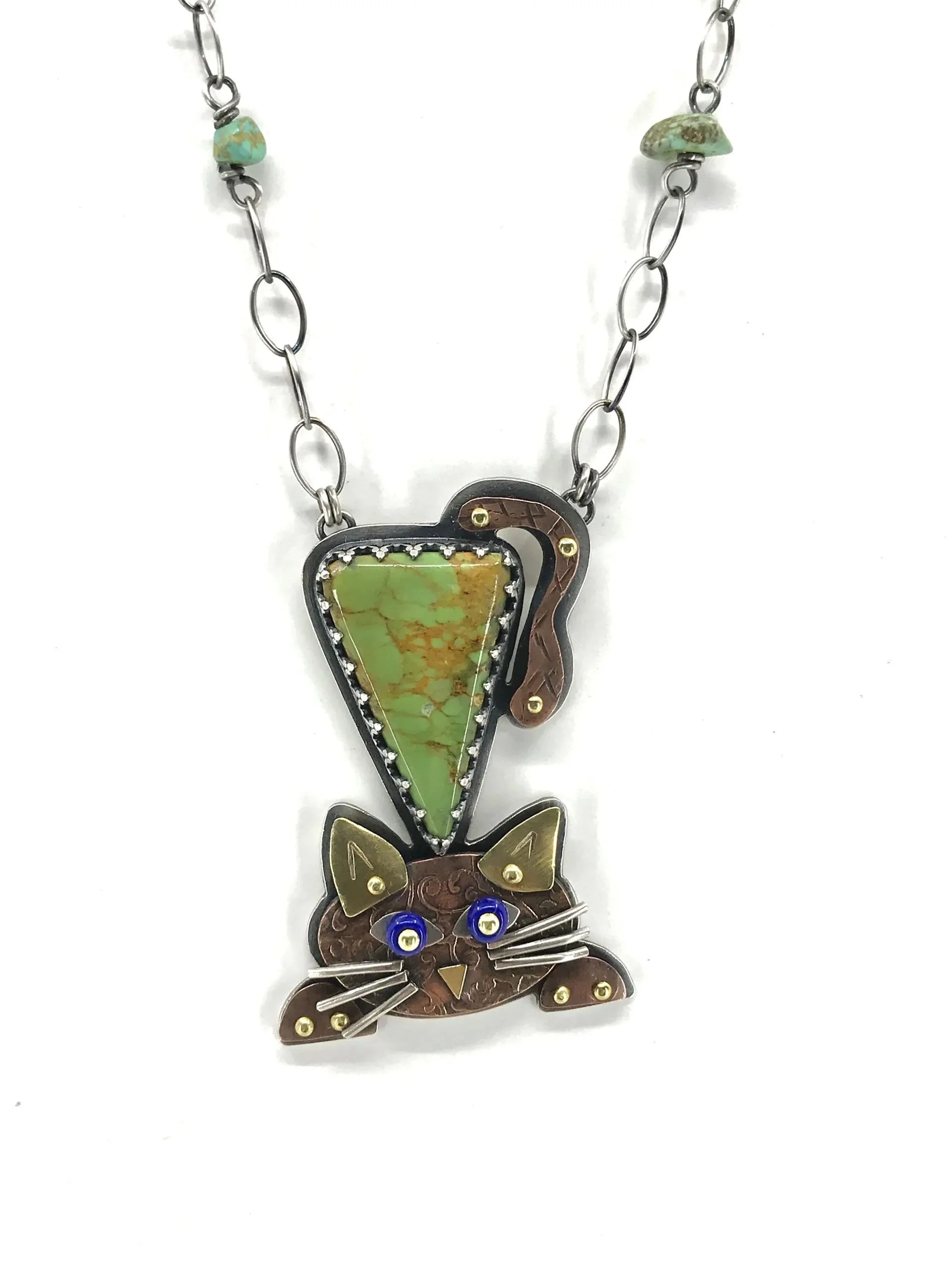 I like to use a mix of metals such as copper, brass, sterling, anodized aluminum as well as precious, semi-precious stones, and natural stone cabochons. At times I may use unexpected elements such as vintage buttons, plastic, and found objects. Recently, I have begun using new materials such as enamel, resin, metal clay, and even jewelers cement in my creations.